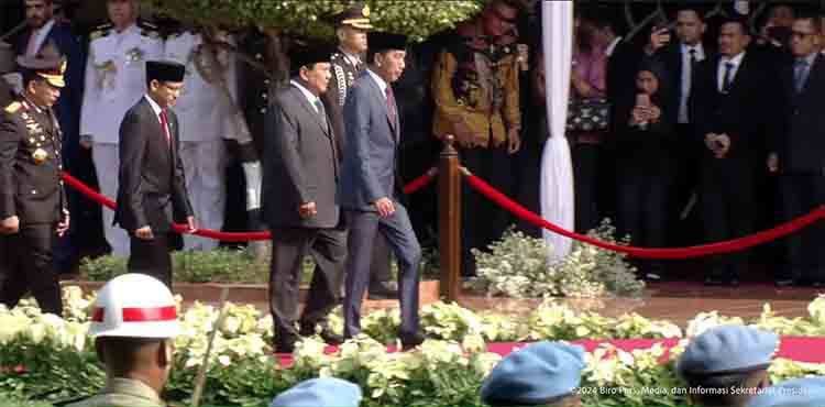 Presiden Jokowi tiba di tempat upacara pukul 07.54 WIB, beriringan dengan presiden terpilih 2024 Prabowo Subianto. Di belakang keduanya, terlihat Mendikbudristek Nadiem Anwar Makarim, Panglima TNI Jenderal Agus Subiyanto, Kapolri Jenderal Listyo Sigit Prabowo, Kepala Staf Angkatan Darat Jenderal TNI Maruli Simanjuntak, Kepala Staf TNI Angkatan Laut Laksamana TNI Dr. Muhammad Ali, dan Kepala Staf TNI Angkatan Udara Marsekal TNI M. Tonny Harjono.